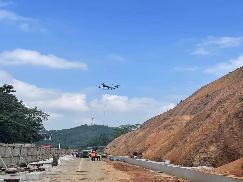 金秋时节,建设热潮涌动赣南大地。在2025南康区G105线灾毁恢复重建工程施工现场,面对3、4级高边坡施工环境,传统陆路运输受地形制约严重,传统调运方式无法实施,人工搬运又效率低下且安全隐患严重,项目部创新科技,在实践中运用无人机吊运技术,将铁丝网、水泥等关键材料精准空投至作业面。这一举措不仅突破了地理限制,更显著提升了施工效率。通过科技赋能,项目部有效应对了作业高度高、运输难、风险高的三重挑战,展现了现代化工程建设的智慧与担当。